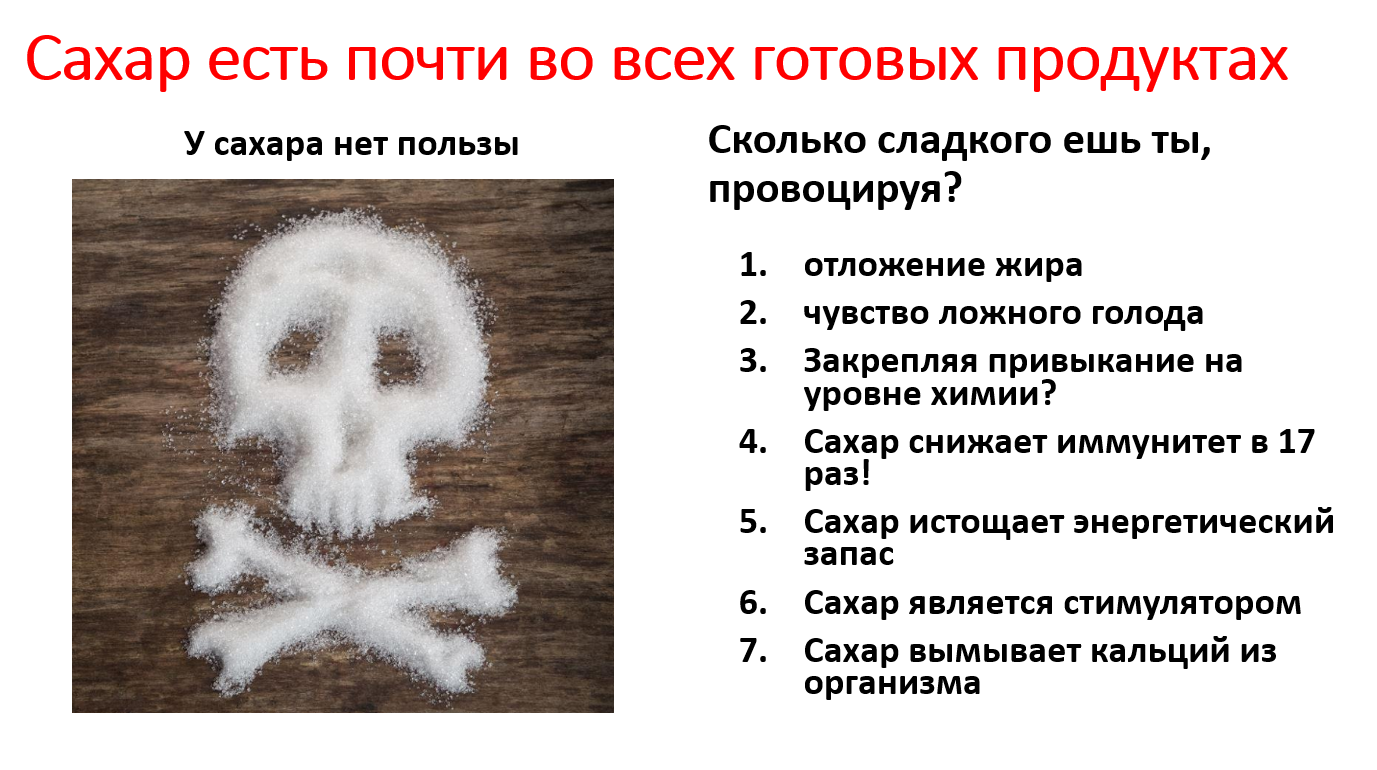 Почти каждый продукт содержит сахар( есть список 35 названий сахара, в которых продуктовые компании прячут избыток глюкозного допинга.