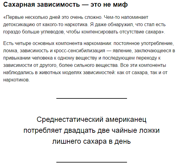 Убирая сладкое- а значит избыток сахара, глюкозы и сахарозаменителей, ты перестаешь быть наркозависимым.![]()